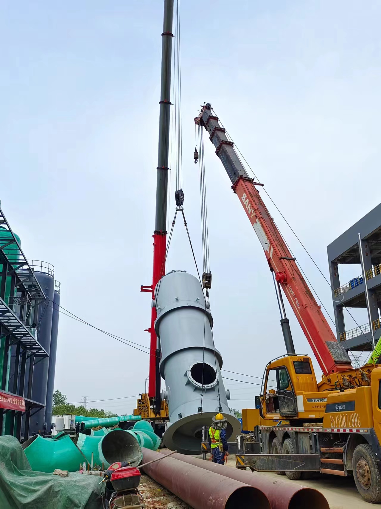 此次投運(yùn)的石墨急冷塔直徑達(dá)3500mm*12000mm,創(chuàng)國內(nèi)同類設(shè)備之最。針對鋰電池電解液行業(yè)固廢焚燒產(chǎn)生的酸性廢氣急速冷卻的技術(shù)難題,研發(fā)團(tuán)隊(duì)攻克了大型石墨設(shè)備結(jié)構(gòu)設(shè)計(jì)、耐腐蝕密封工藝及高效傳熱優(yōu)化等關(guān)鍵技術(shù),實(shí)現(xiàn)了設(shè)備在極端工況下的穩(wěn)定運(yùn)行。與傳統(tǒng)冷卻設(shè)備相比,其噴淋吸收效率提升30%以上,能耗降低15%左右,顯著提升了鋰電池電解液行業(yè)固廢焚燒產(chǎn)生酸性廢氣處理過程中的安全性和環(huán)保性。